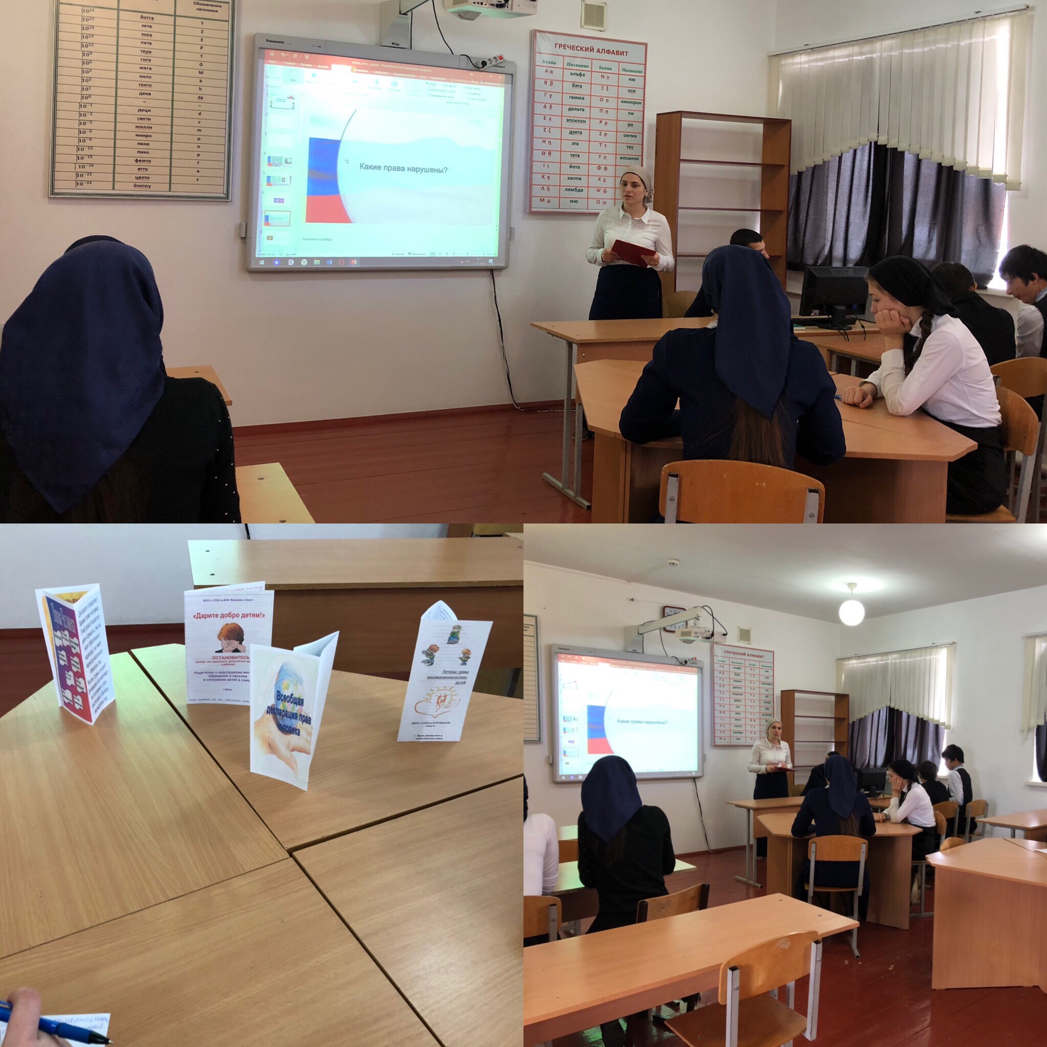 Учащимся было продемонстрировано видео-обращение уполномоченного Президента по правам человека в РФ Т.Н. Москальковой. В ходе открытого урока учащиеся познакомились с основными правами человека «Права человека- правила, обеспечивающие защиту достоинства и свободы каждого отдельного человека» Также учащиеся, узнали о главных ст. международных документов по правам человека «Всеобщая декларация прав человека», «Конвенция о правах ребенка».