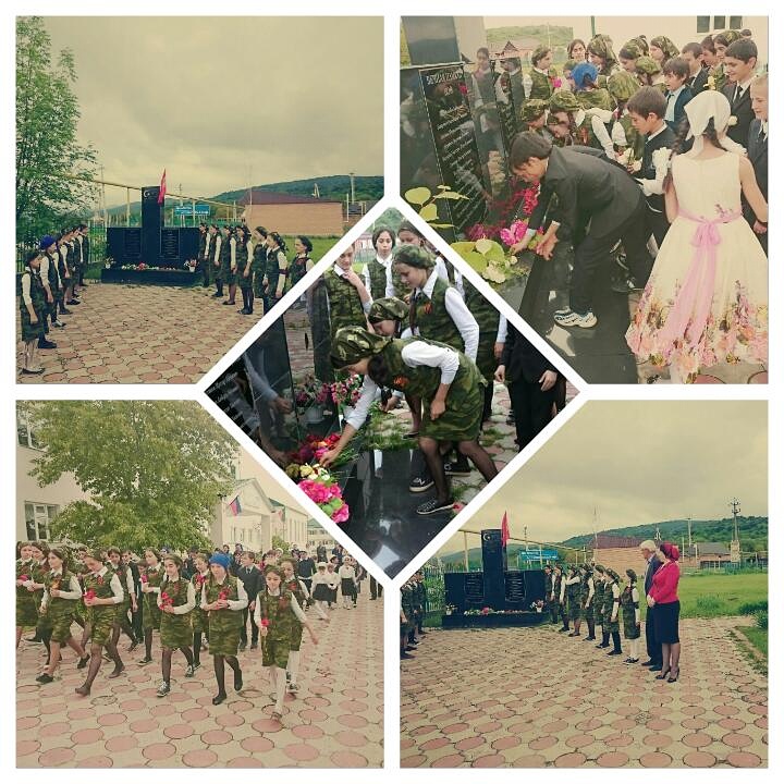 Сегодня в этот праздник учителя и ученики нашей школы положили цветы у памятника павшим защитникам Родины. Военно -патриотическая команда 'Зенит', состоящая из учениц школы, прошла маршем до памятника и отдала честь Героям Великой Отечественной войны.