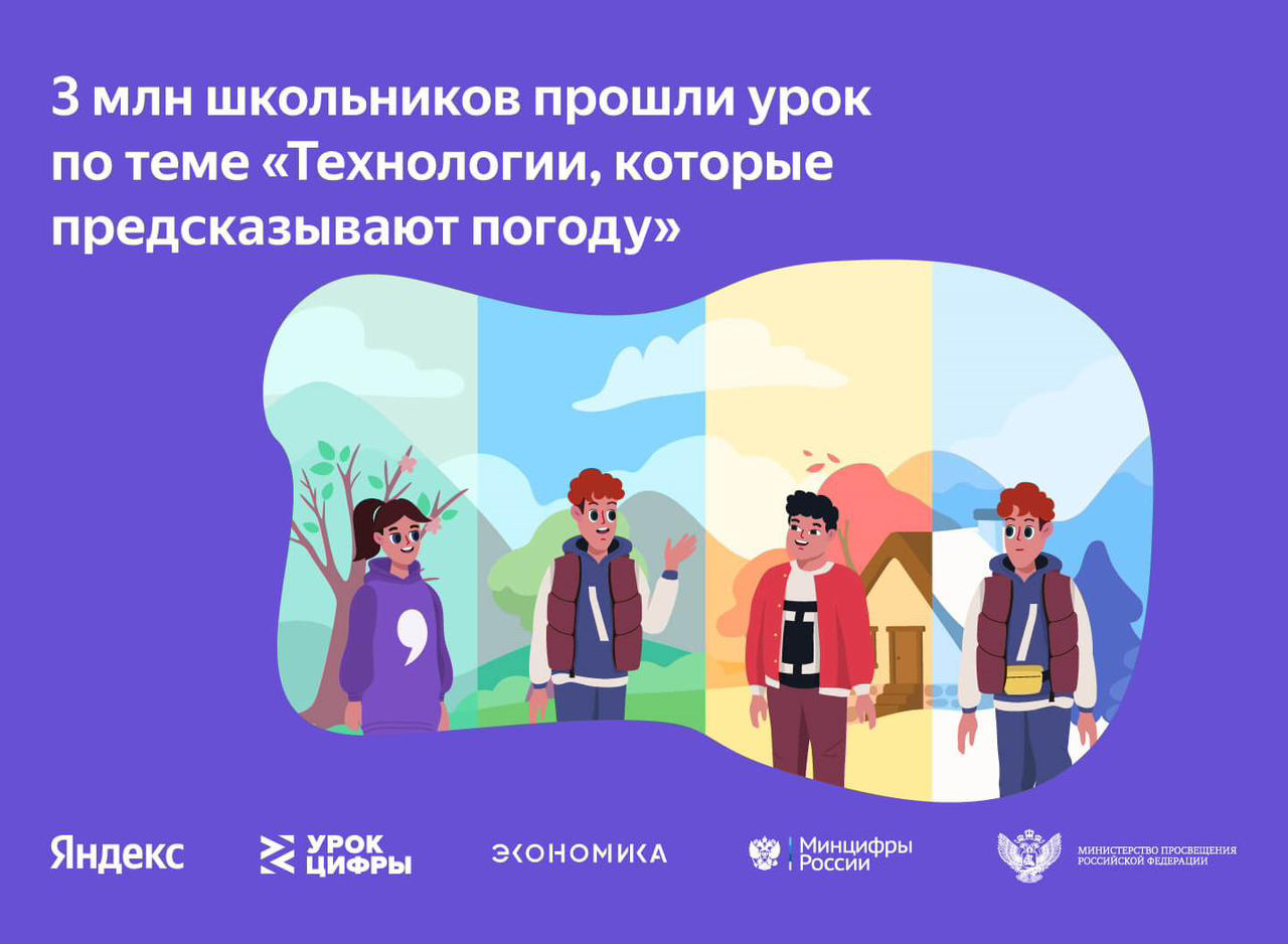 Яндекс проводил «Урок цифры» на тему «Технологии, которые предсказывают погоду» с 16 января по 5 февраля. Ученики узнали, за что в прогнозировании отвечает искусственный интеллект, а за что — человек, сколько разных специалистов участвует в составлении прогнозов и почему даже самые умные ИИ-модели ошибаются.